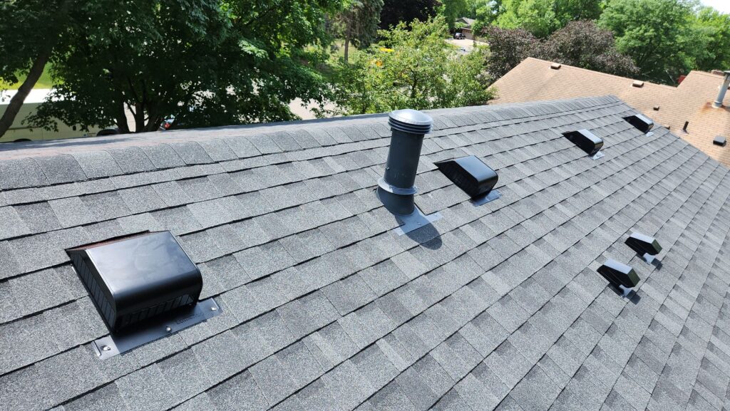 We started by removing the shingles and underlayment, then damaged plywood, and we replaced it with OSB, a durable and moisture-resistant material. OSB provides a solid foundation for the new roof. Next, we turned our attention to the attic ventilation. Poor airflow allowed condensation to accumulate, so we ensured the attic had proper venting with a balanced system of soffit and ridge vents. We use Lomanco 750 slant-back vents, the best in the industry. This upgrade promotes air circulation, keeping the space dry and preventing future issues like mold, wood rot, or ice dams during Minnesota’s harsh winters.