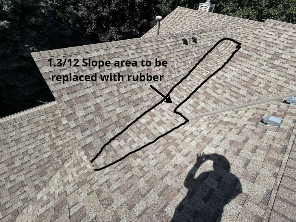 One major red flag was the handling of low-slope sections. In roofing, pitch refers to the steepness of the roof, measured in ratios like 2/12, which means the roof rises 2 inches for every 12 inches of horizontal run. Anything below that threshold requires specialized materials to prevent water pooling and leaks. Unfortunately, the previous crew had installed standard shingles in several valleys where the pitch dipped below this minimum. This led to water accumulation, which eventually found its way into the interiors, causing damage in multiple units.
